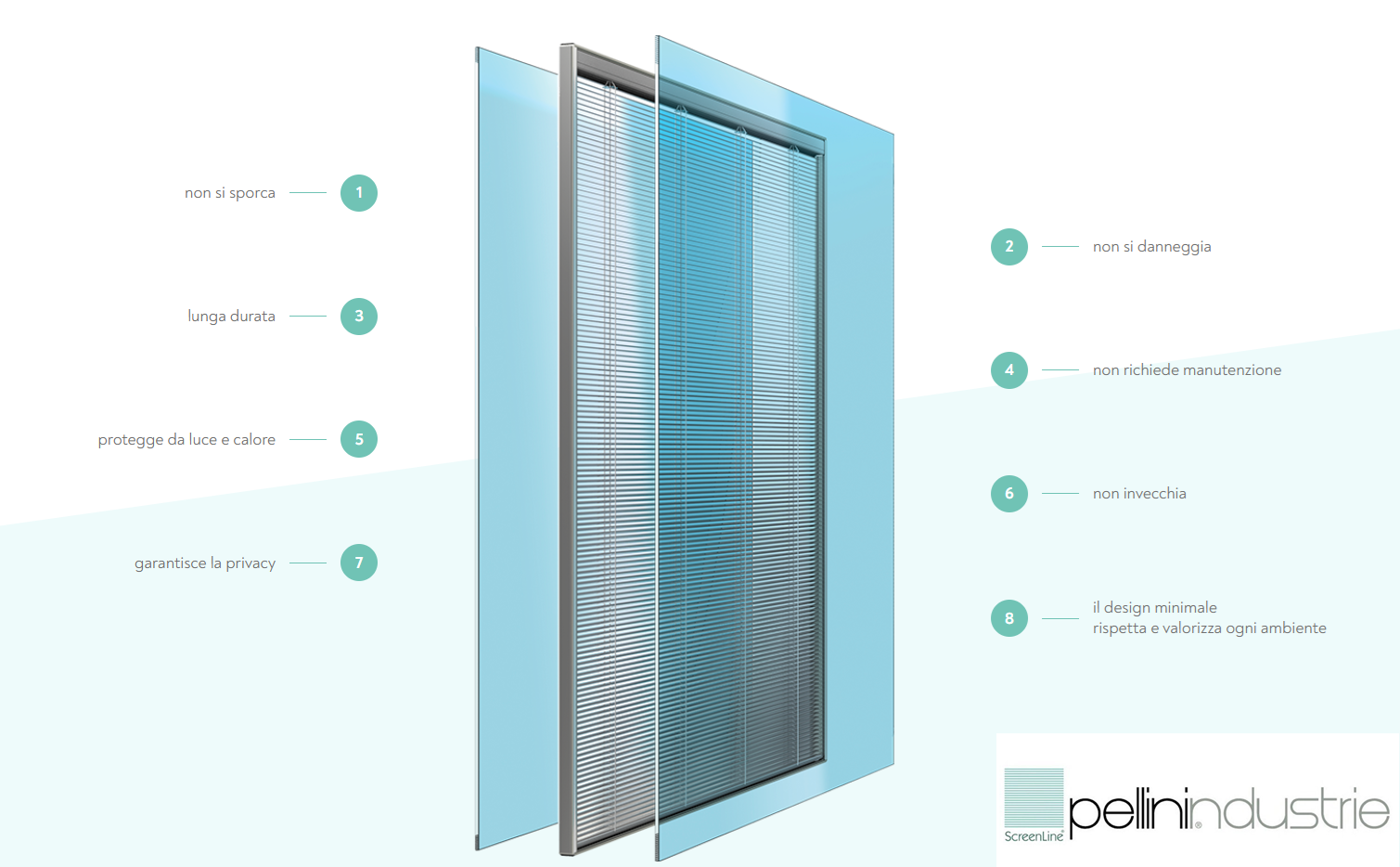 Le tende/veneziane Pellini ScreenLine® vengono collocate all'interno di una vetrocamera, perciò muovendosi in un ambiente sigillato sono protette da aria, sporcizia e agenti atmosferici e non richiedono quindi nessun tipo di manutenzione.